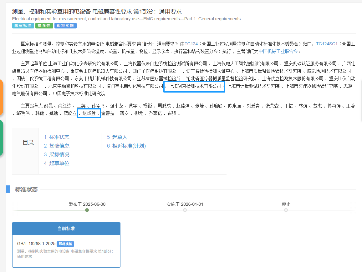 最新消息,2025年06月30日,根據(jù)國家標(biāo)準(zhǔn)化管理委員會(huì)官網(wǎng)顯示,中國國家標(biāo)準(zhǔn)公告,創(chuàng)京檢測總經(jīng)理趙華勝參與編制的標(biāo)準(zhǔn)GB/T 18268.1—2025《測量、控制和實(shí)驗(yàn)室用的電設(shè)備 電磁兼容性要求 第1部分:通用要求》推薦性國家標(biāo)準(zhǔn)批準(zhǔn)發(fā)布,新版標(biāo)準(zhǔn)將于2026年1月1日起正式實(shí)施。